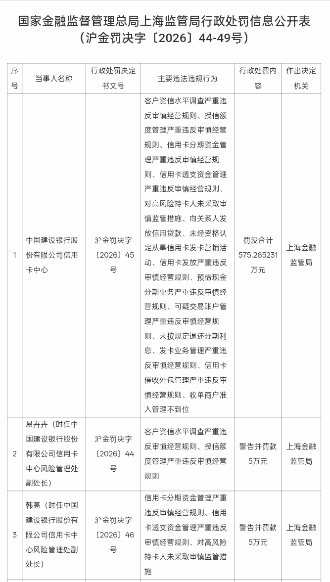 - [财经]中国建设银行信用卡中心涉14项审慎经营违规被罚没超575万元