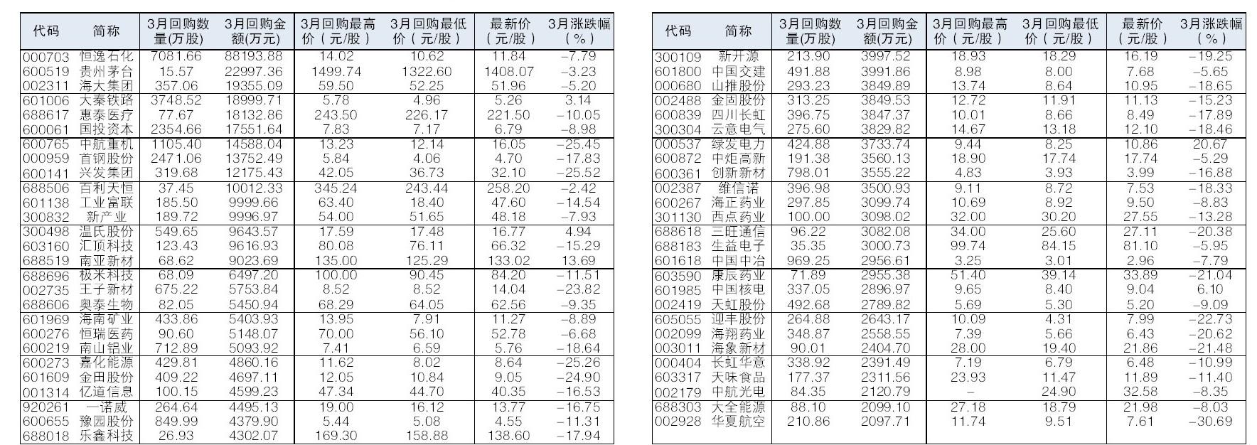 - [财经]53股3月实施回购金额逾两千万元