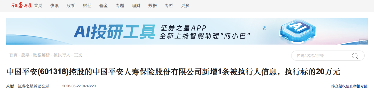 - [财经]列为被执行人!中国平安人寿保险股份有限公司执行标的20万元