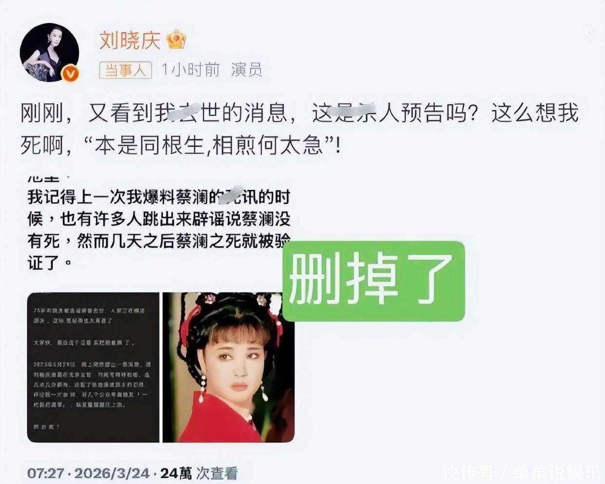 - [娱乐]刘晓庆“被造谣去世”风波再反转!亲妹妹反咬互曝黑料