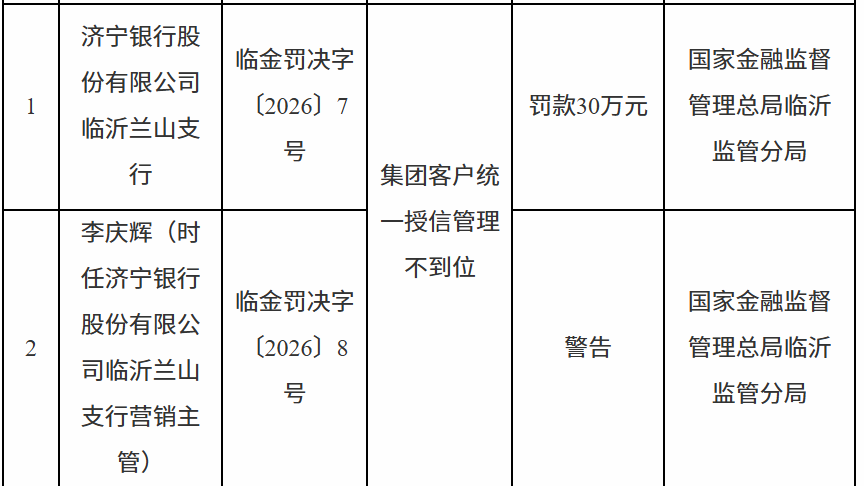 - [财经]济宁银行临沂兰山支行因集团客户统一授信管理不到位被罚款30万元