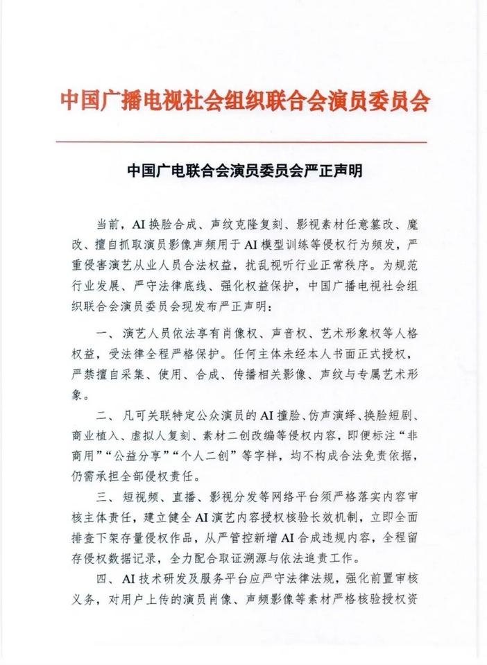 - [社会]针对AI换脸、声纹克隆......中国广电联合会演员委员会严正声明
