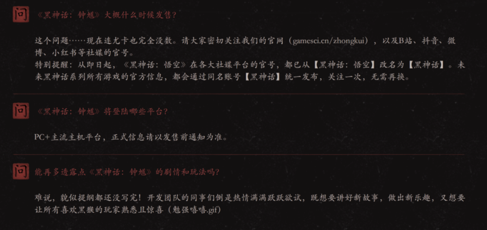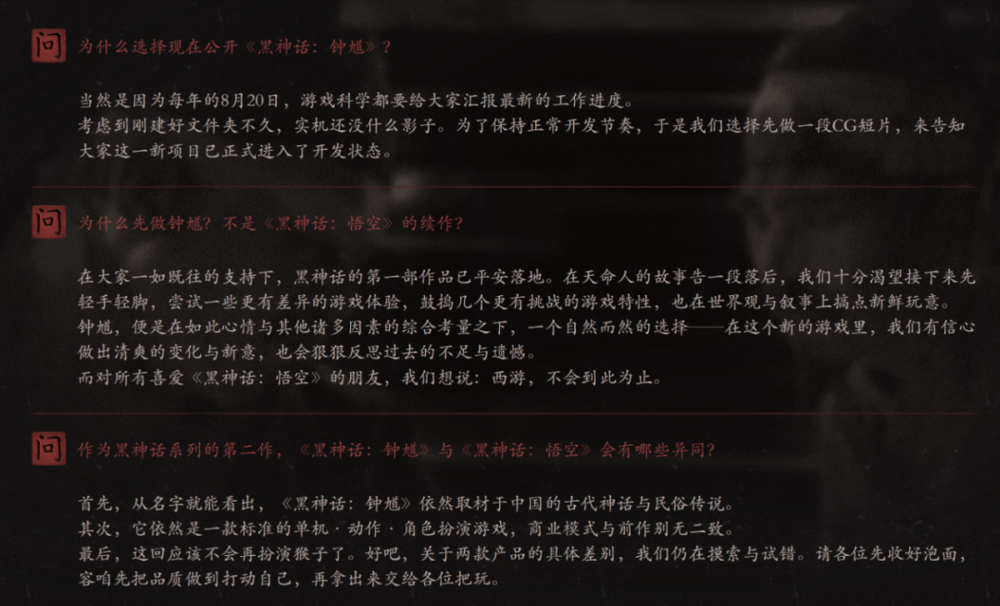 藏于台北故宫的《钟馗出猎图》(局部,传为五代南唐顾闳中所作,但有争议) 继续做一些猜想。首先,其 "捉鬼" 的核心设定为游戏提供了无穷无尽的 "敌人" 素材库。中国神话与民间传说中的鬼怪种类繁多,从《山海经》的奇珍异兽,到《聊斋志异》的精怪狐仙,再到地方传说中的水鬼、旱魃,可以构建一个极具多样性和挑战性的怪物生态。玩家扮演钟馗,每一次 "捉鬼" 都可以是一场融合了 "调查 - 追踪 - 战斗 - 收服 / 封印" 的完整任务链,游戏深度和可玩性极强。 其次,钟馗的人设为角色成长和玩法系统提供了坚实基础。他既是善用符箓、法术的 "天师",又是手持宝剑、武艺高强的 "鬼雄"。这使得游戏可以自然地融合动作战斗与法术系统,玩家可以根据喜好培养一个 "剑宗" 或 "气宗" 的钟馗。其标志性的法器,如照妖镜、乾坤袋、朱砂笔等,都很容易转化为各具特色的游戏机制。 我《黑神话:悟空》DLC 呢? 暂且克制一下这种无根无据的揣测,只是有一点可以确定,《黑神话:钟馗》的公布,加深了我们对 "黑神话" 这一品牌的理解。 此前,不少观点认为游戏科学的核心是挖掘 "西游记" 或类似的国民级神话史诗。但《钟馗》的出现表明,他们的视野更为宏大 —— 扎根于整个中国传统民俗的沃土,进行偏暗黑风格(严肃、写实且不回避人性与神性中幽暗面的风格)的现代化解读。从家喻户晓的 "悟空" 到相对垂直的 "钟馗",尝试一个更深邃、更多元的东方奇幻世界,是一条更难的路。 然而,消息释放出来之后,玩家难免还是有一些可以理解的负面情绪:渲染了这么久,我《黑神话:悟空》的 DLC 去哪了? 对于这个问题,在 PV 释放的第一时间,游戏科学联合创始人、《黑神话:悟空》制作人冯骥在官网发布了一篇长文,给出了相当坦诚的回答。 ![]()