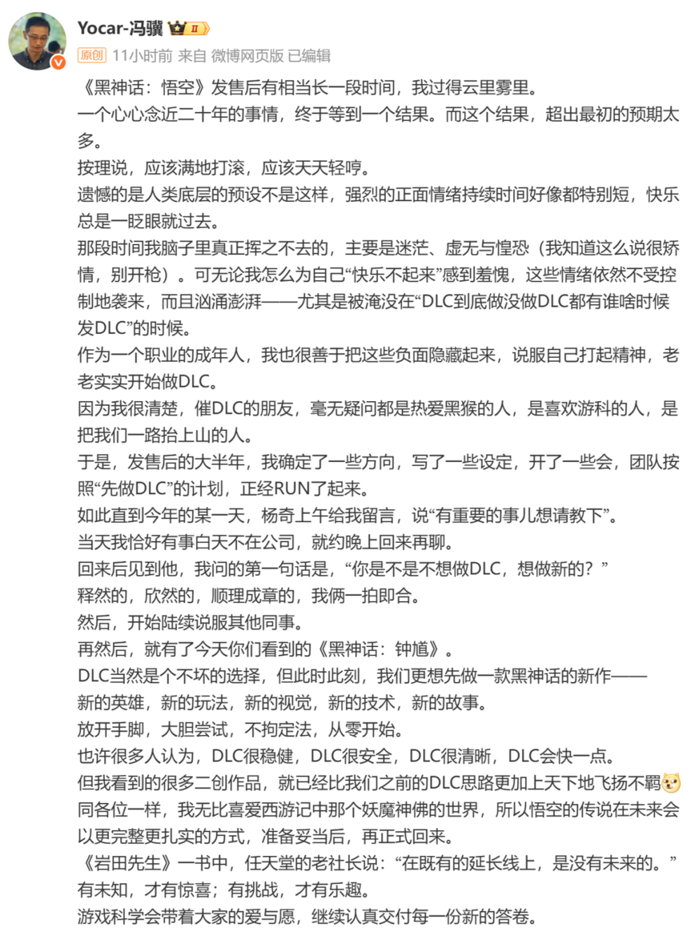 冯骥表示,团队在顺应期待启动 DLC 开发后,核心成员却逐渐感到创作激情被消磨。最终,在与美术总监杨奇等人达成共识后,他们做出了搁置 DLC、开启全新项目的决定。冯骥引用任天堂前社长岩田聪的名言 "在既有的延长线上,是没有未来的",为这个看似冒险的决策给出了精神注脚。 但仅仅解读这篇公告,或许仍然不够。我们更应该分析,为什么游戏科学会放弃 "做 DLC" 这个在商业上更稳妥、风险更低、也更能快速回应玩家热情的选择? ![]()